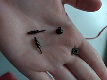 Пришли за 3 недели, тяжелые, металлические, пыталась поцарапать их, но краска не слезла. Серебристые "саморезы" раскручиваются с двух сторон, а вот черные можно надевать только с обратной стороны уха, что не всем будет удобно. За эти деньги серьги 100/10, закажу еще)