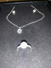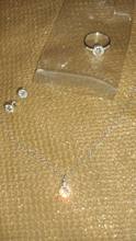 This Ring is ABSLOTELY GOURGEOS the neckalce and earrings are to they match exactly with the rings dimond I highly recomend it was hard to get a close up since the ring what shining it might turn ur finger a little green though