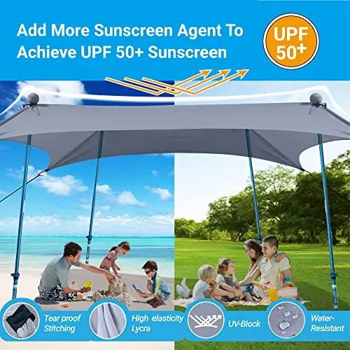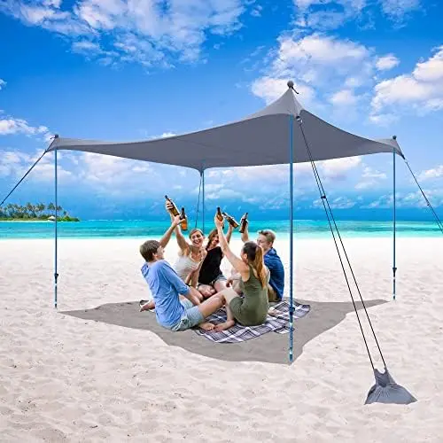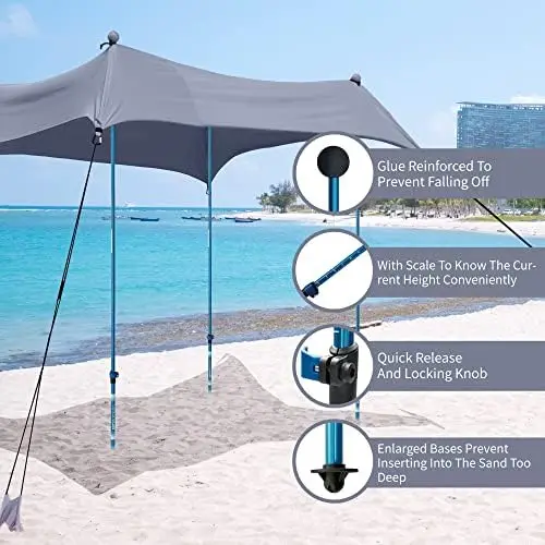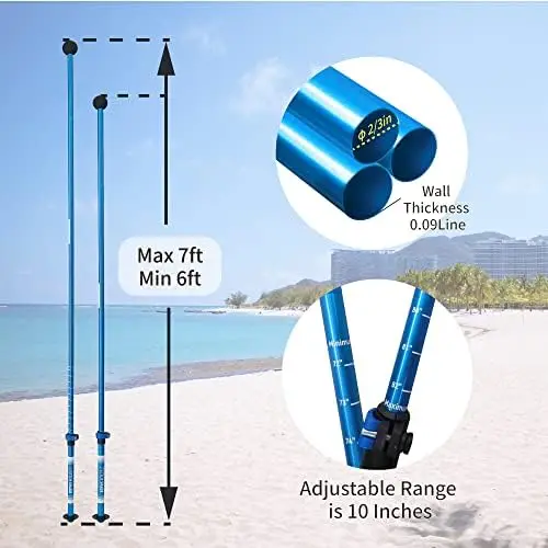 UNIQUE ADJUSTABLE POLES:4 unique height adjustable aluminum poles can be adjusted according to the sun\’s position to get more shade. Scale marking allows you to know the current height of the pole quickly. The shiny royal blue coat of the bar body sets you apart on the beach, and the quick-release structure makes height adjustment easier. The locking knob locks the label more tightly and prevents it from slipping off.