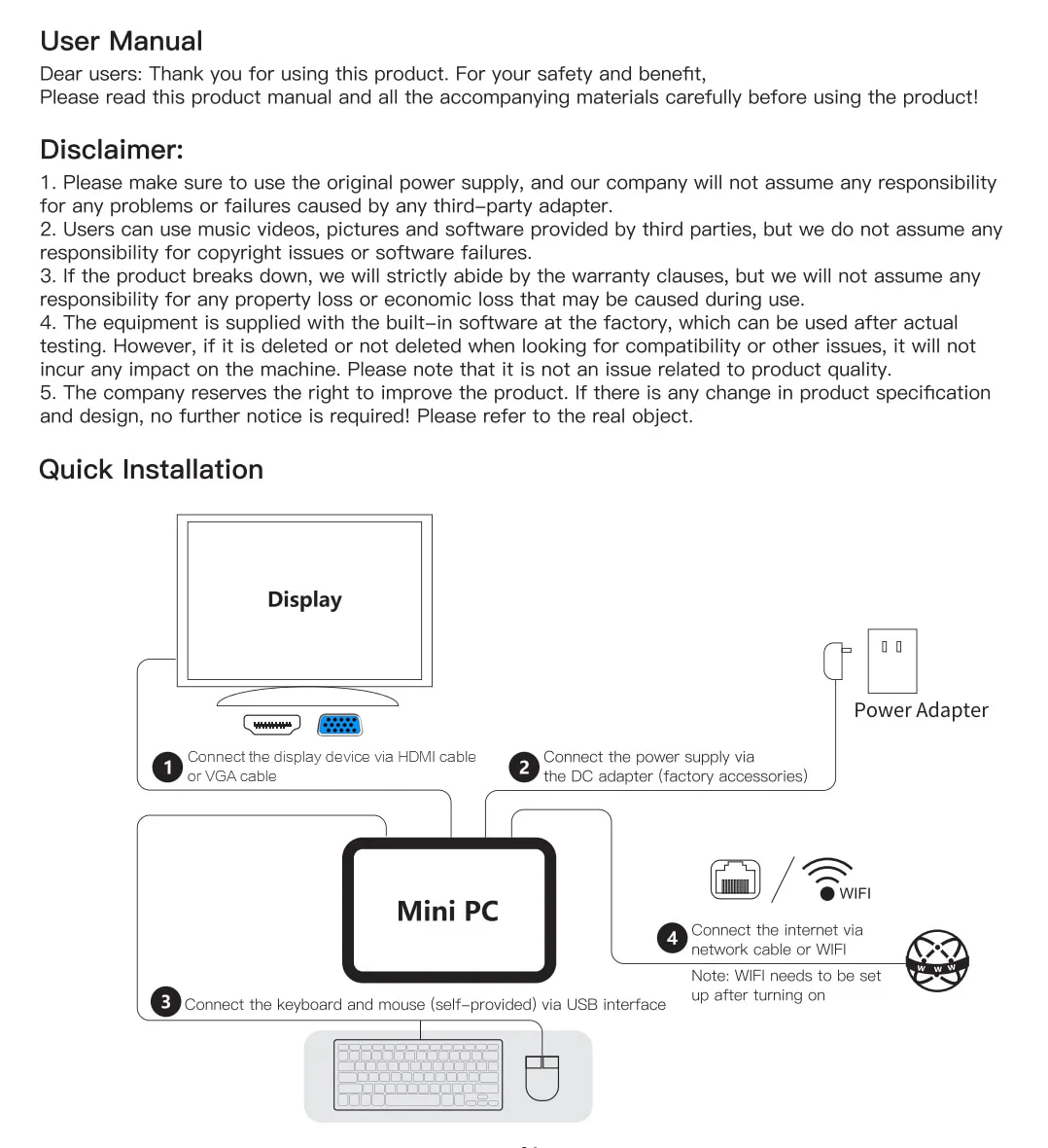 This mini pc seems to do its job. Installing windows is somewhat time consuming. But, everything seem to be going well. The shipment and delivery of my order was fast and correct.