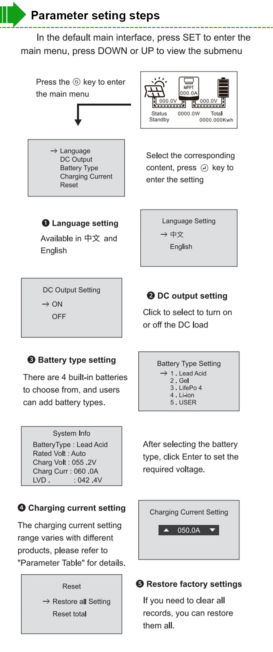 Setting: (battery type, charging current, charging voltage and discharge voltage,return to factory), |