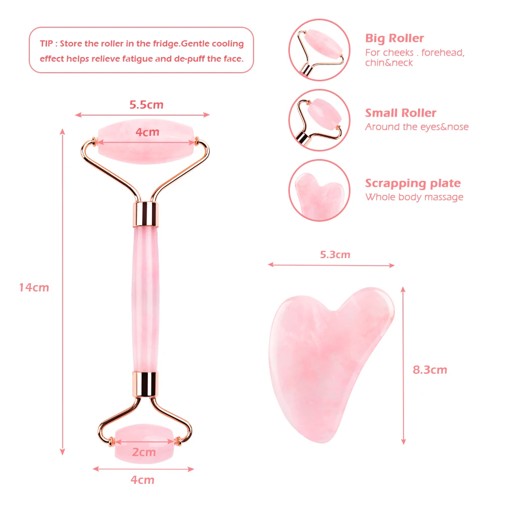 • √ Dual Sides Rose Quartz Roller- The big roller is ideal for neck, chin, cheeks, and forehead while the smaller is perfect for around the eyes, nose, and lips. The roller promotes blood circulation, which can reduce puffiness and wrinkling