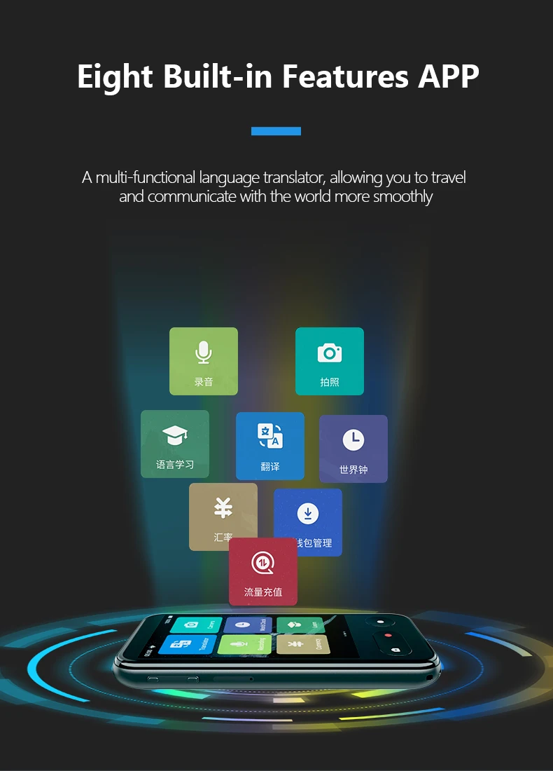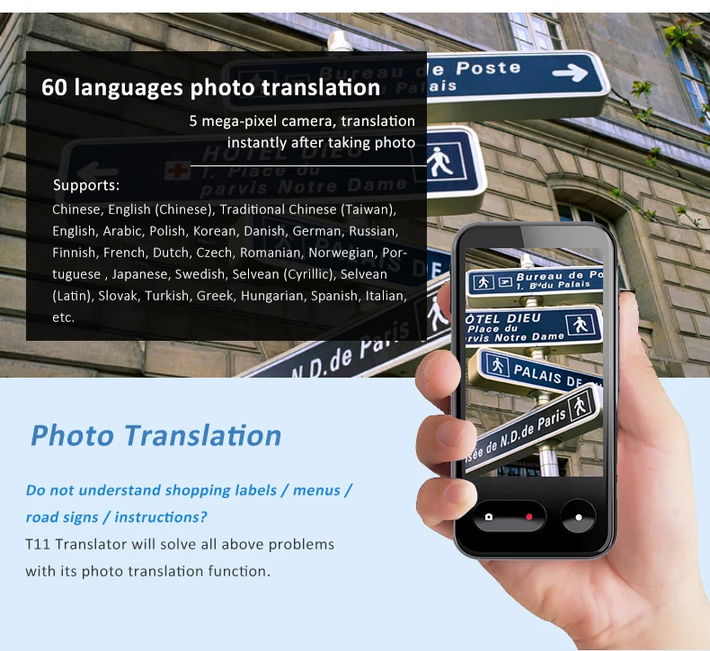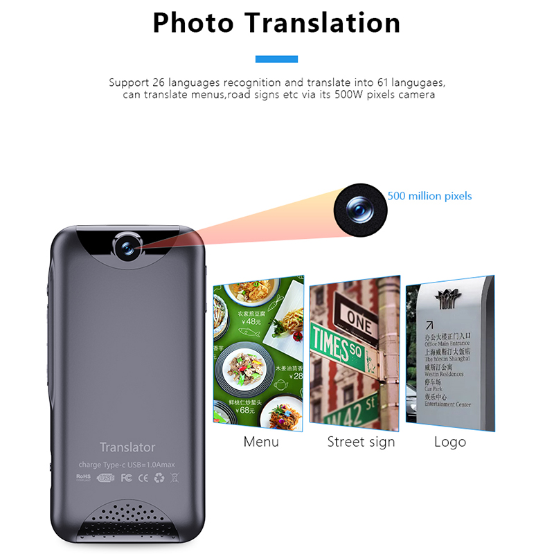 The translation function can be realized by taking pictures. It supports 61 languages translation, 26 languages mutual shooting and mutual translation, 35 voice broadcasts, and languages will continue to be added in the future.