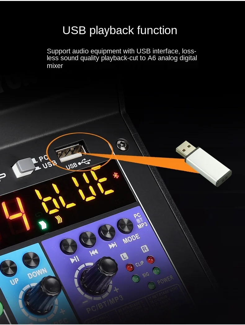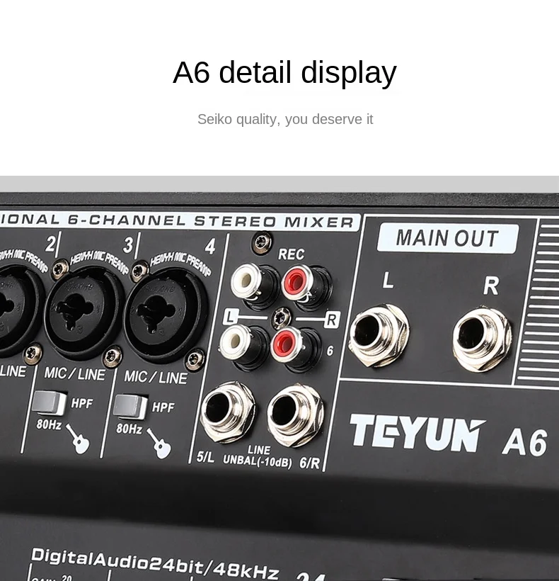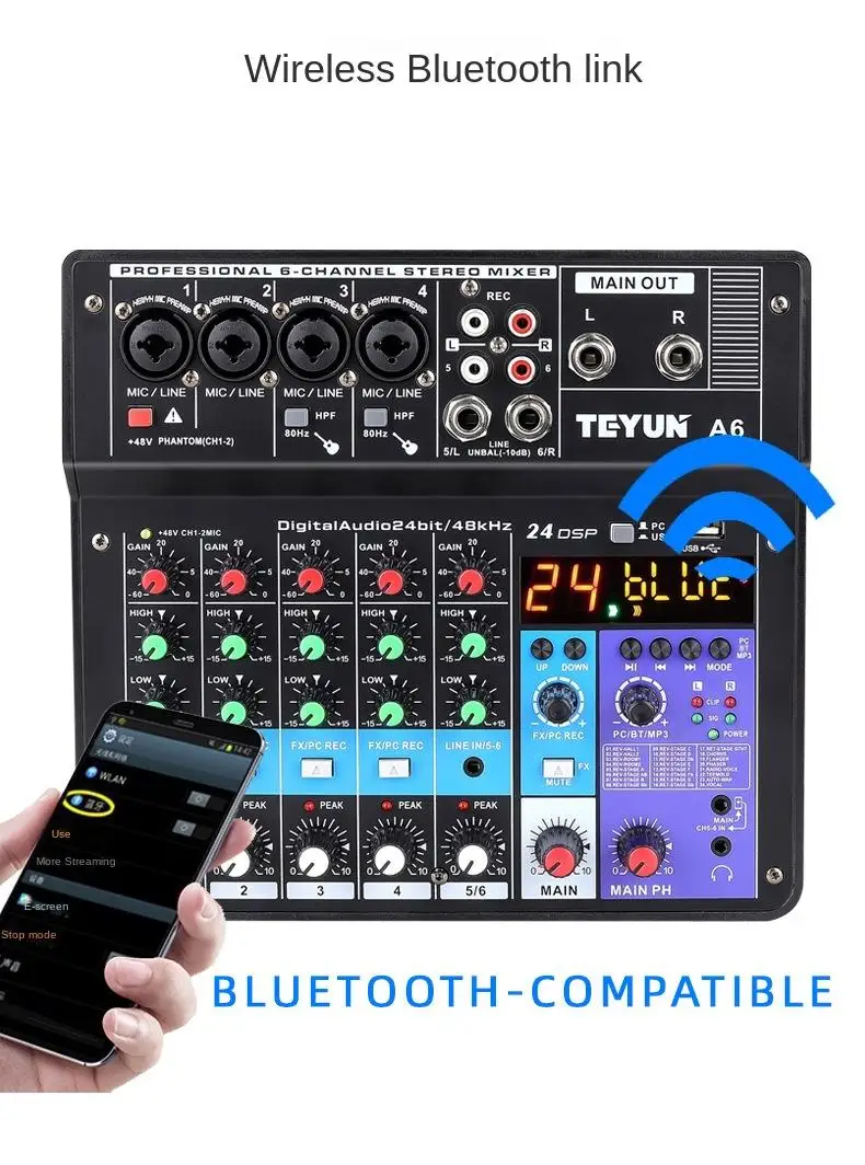 This mixer is a multi-purpose with a sound card4Channel mixer,Can satisfy the user’s family music production,Live webcast,KSong cover and other needs。Product characteristics:The mixer is equipped、Input Gain and High Bass Adjustment、Built-in48VPhantom power supply is suitable for direct power supply of condenser microphone、High Definition Headset Output Port、MP3Player、Bluetooth reception、With connectionPCSound card。The mixer is small in size.、Lightweight,Can be directly connectedPCTheUSBPort power supply,No additional power supply required,Can be throughUSBConnect the computer to supply power to run,The trouble of using an external adapter is saved.,You can also use mobile power orUSB AC/DCThe adapter powers it。