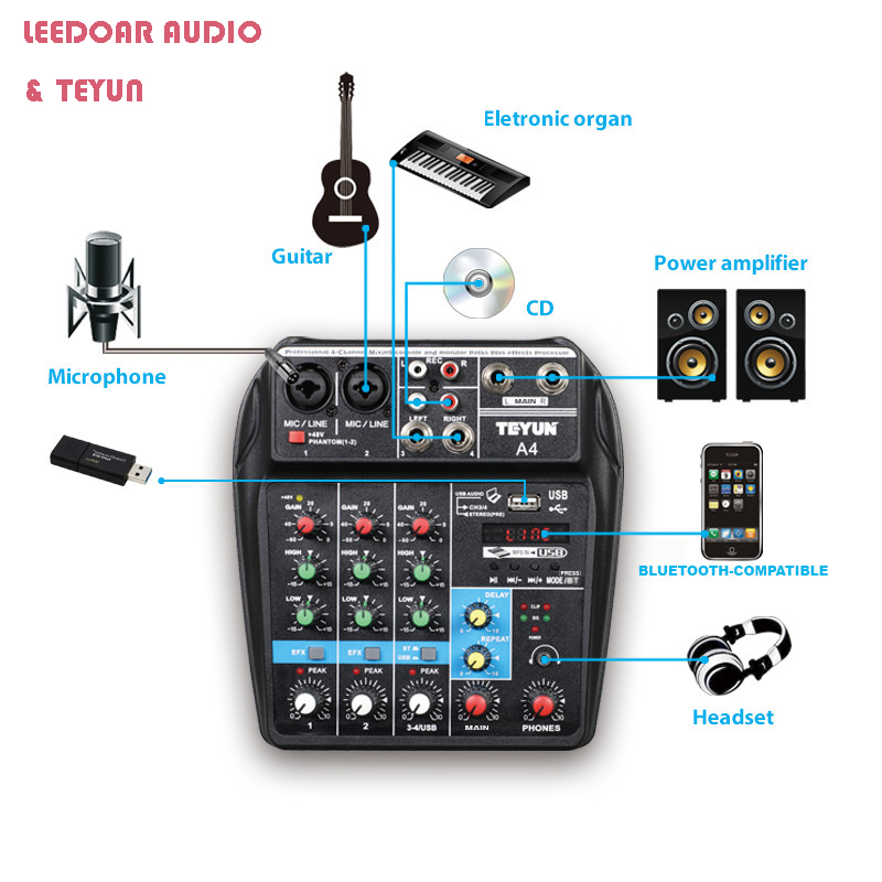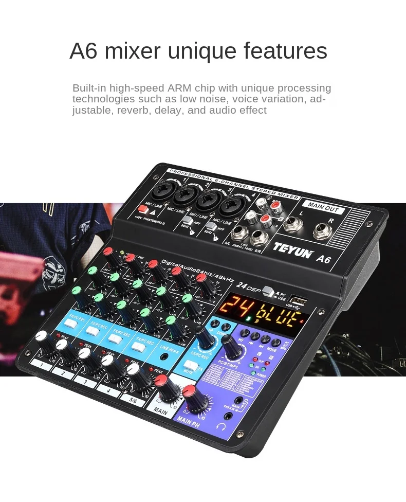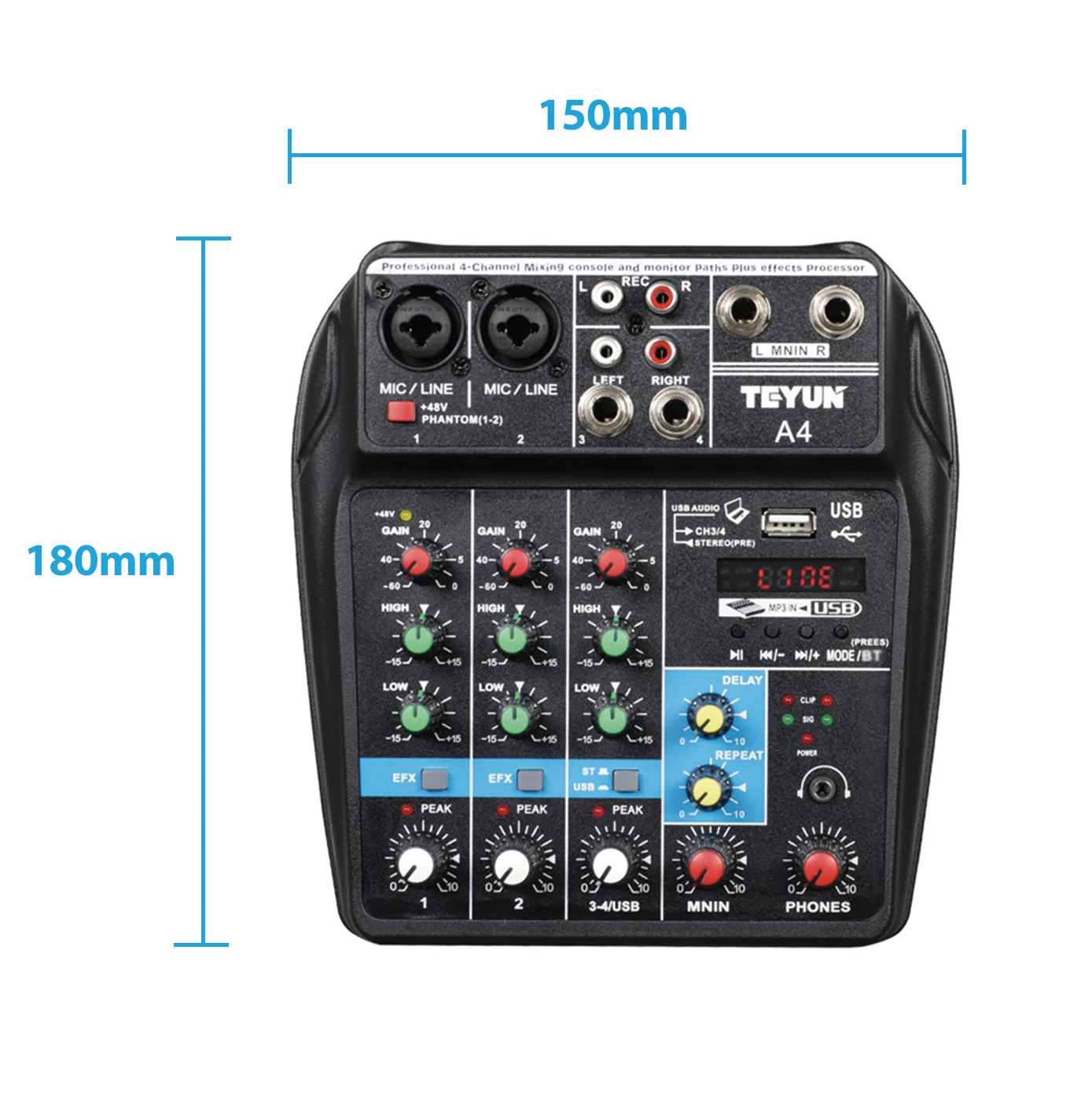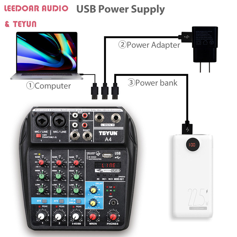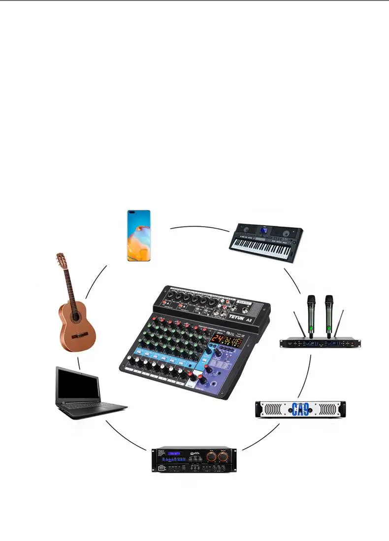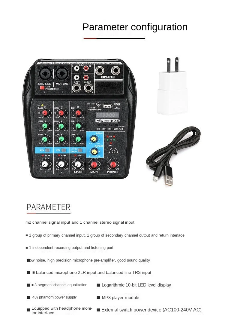 Product descriptionThe mixer is a multi-purpose 4-channel mixer with a sound card that can be meet users of home music production, webcast, K song and other needs.FeaturesThe mixer is equipped with input gain and high bass adjustment, built-in 48V phantom power supply for condenser microphone direct power supply, high-definition headset output port, MP3 broadcast, device with a sound card can be directly connected to the PC.Mixer compact, lightweight, can be directly connected to the PC’s USB port power supply,No additional power, can be connected to the computer through the USB power supply to run, eliminating the need forWith the trouble with an external adapter, you can also use the mobile power or USB AC / DC.The adapter is powered by the adapter.