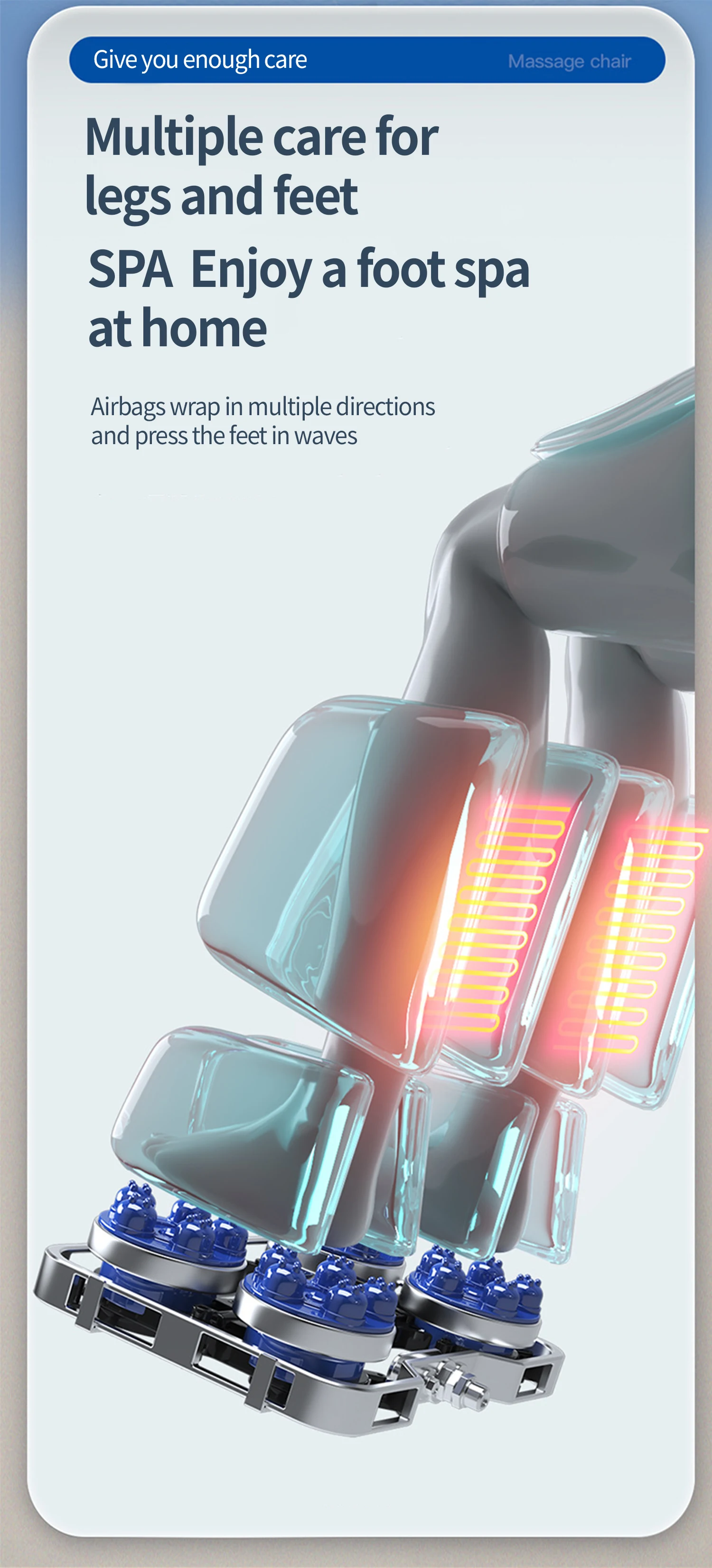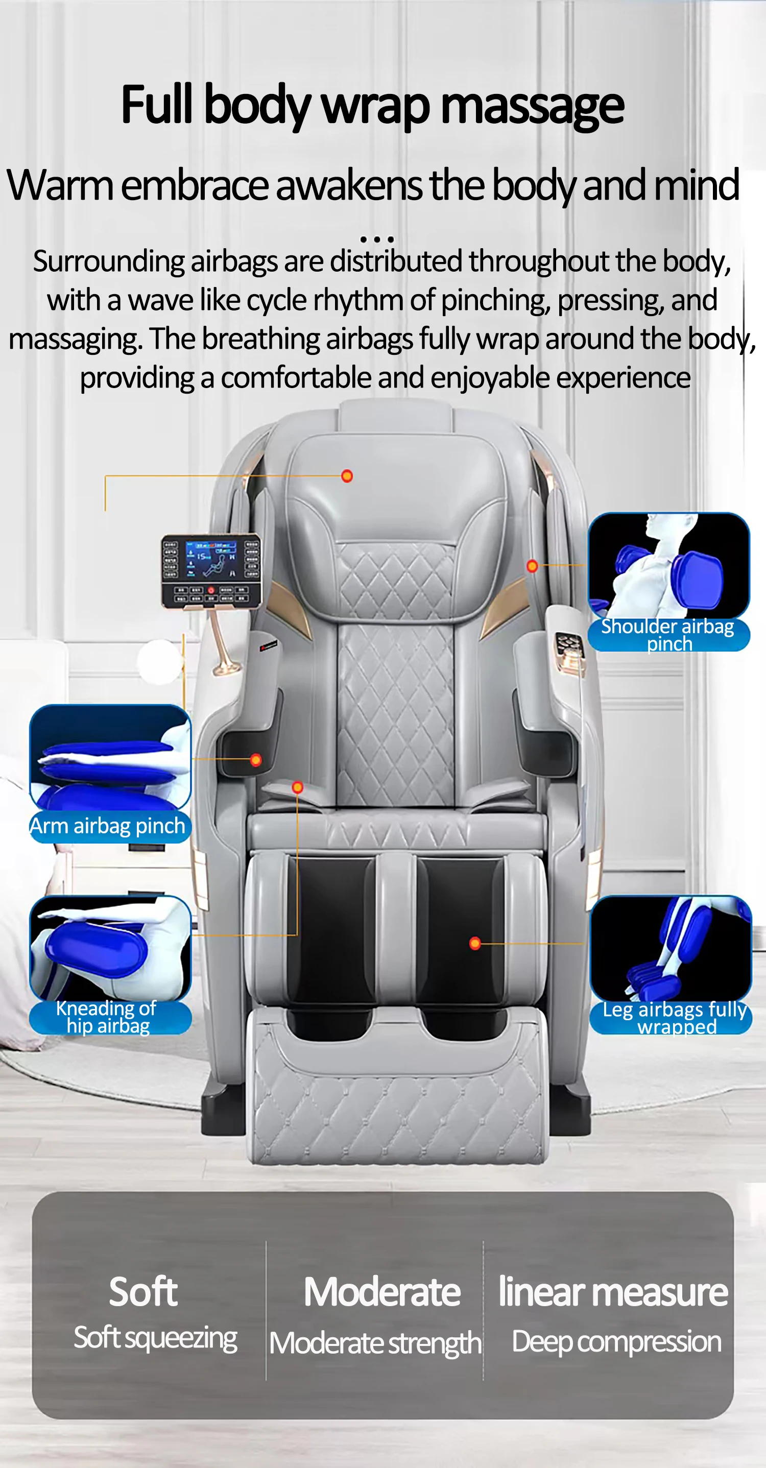 Surrounding airbags are distributed throughout the body,with a wave like cycle rhythm of pinching, pressing, and massaging. The breathing airbags fully wrap around the body,providing a comfortable and enjoyable experience