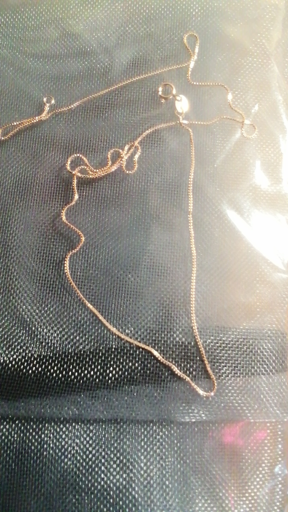 Received after a month and a half. Packed well. I liked the chain very much. Very thin, graceful. Well done. Color Russian gold. The clasp works. Probably silver, does not stick to the magnet. Checked. I definitely recommend the store and the product.