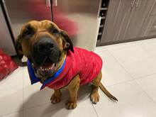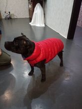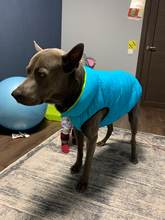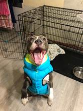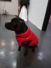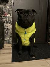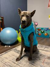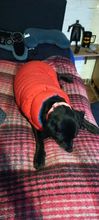 Le quedó perfecto! Compré la talla más grande mi perro es una fila brasilero y sufre mucho con el frío! Feliz con mi compra! Compraré más colores!